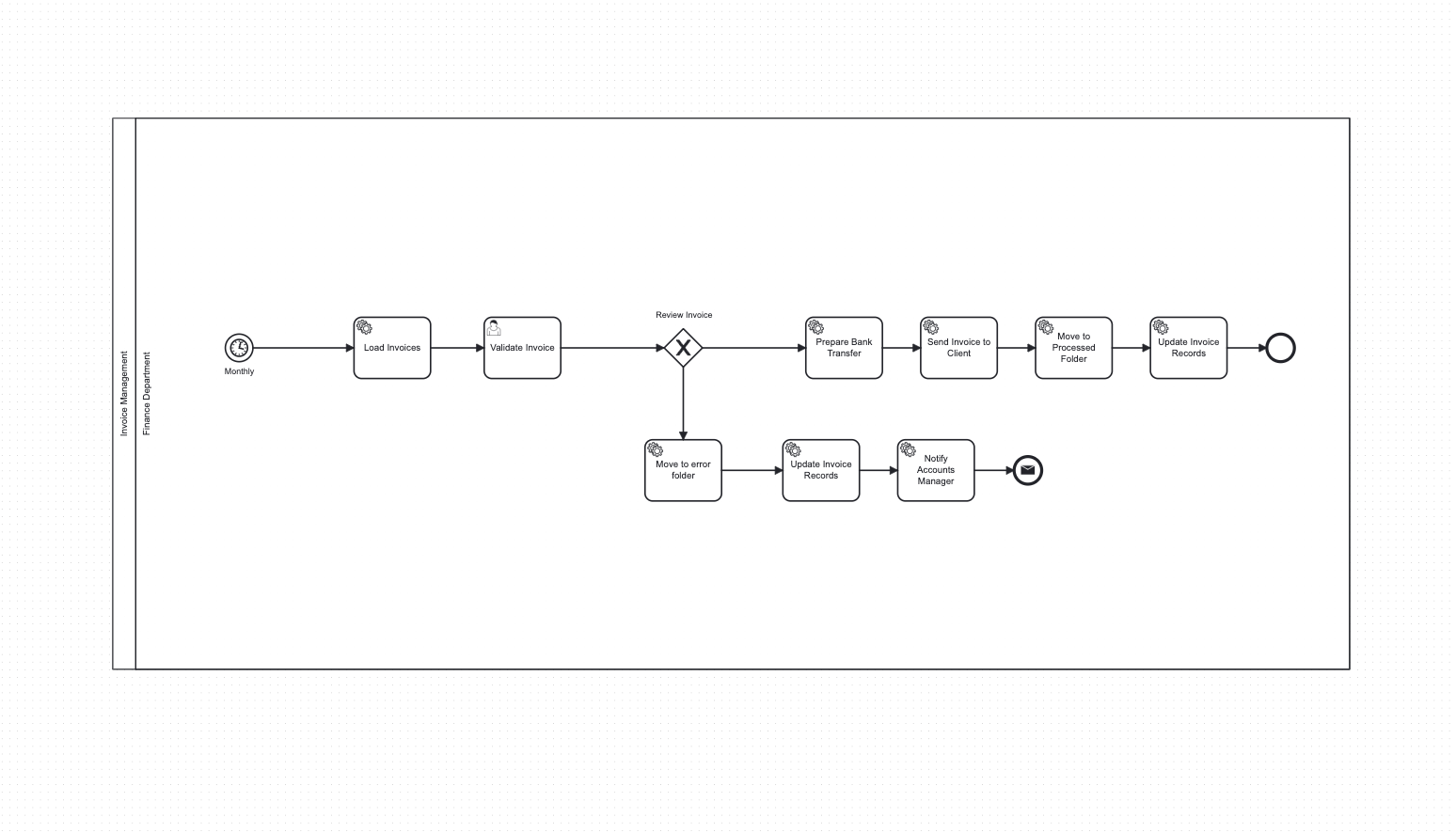 A dedicated invoice process with templated records, validation and review, structured storage, and a controlled send/update flow — again with exception handling through error routing.