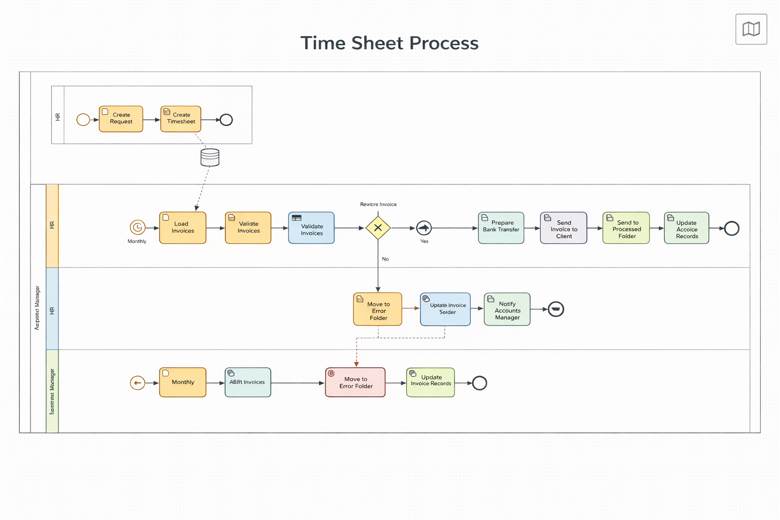 SmartInvoice is a process digitalization project where we re-designed a manual timesheet and invoicing workflow into a structured, traceable, and automation-ready system. The solution is organized into two pillars — Timesheet Management and Invoice Generation — with clear validation, decision logic, and exception routing.