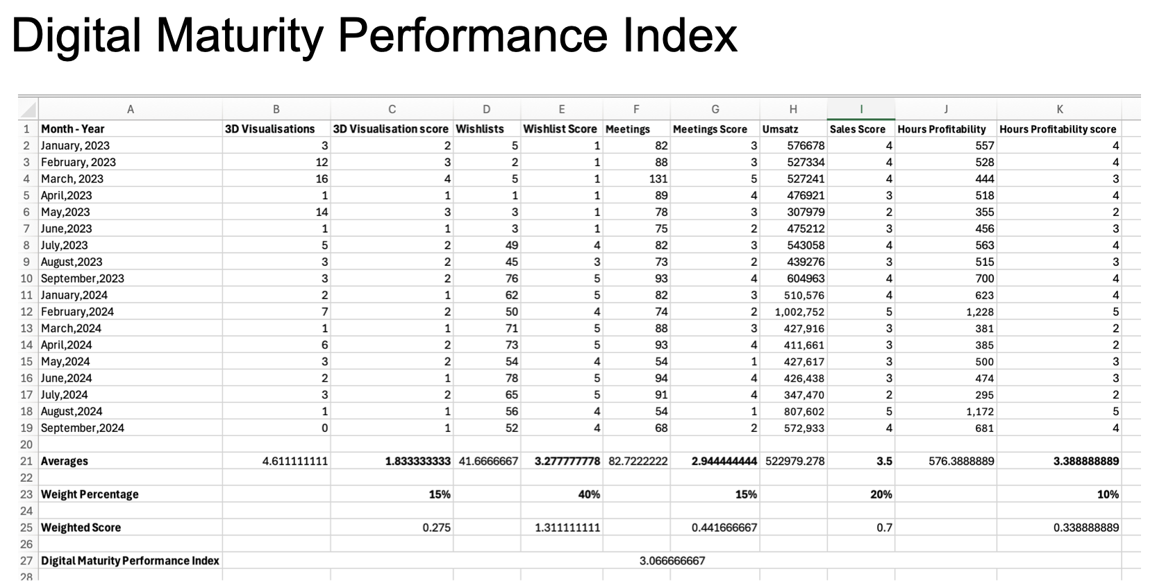 I consolidated separate KPIs into one weighted score so management can benchmark showrooms consistently and spot where investment will likely help most.