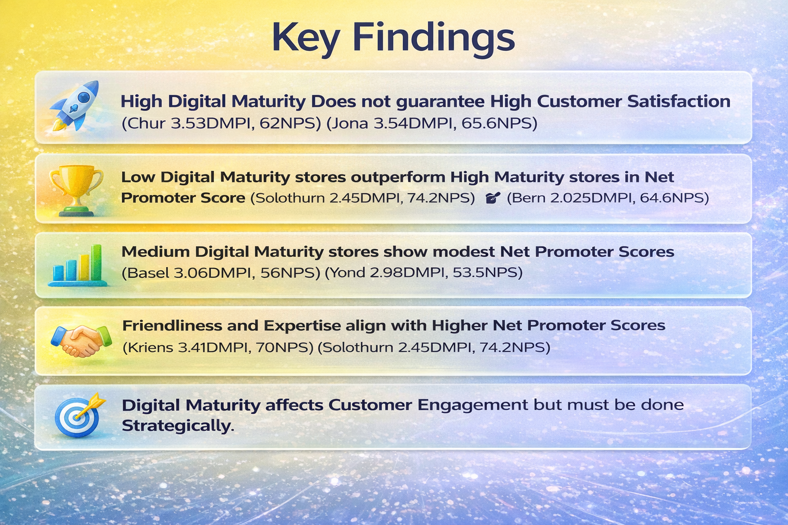 In this thesis, I investigated whether higher digital maturity translates into higher customer loyalty and experience. I developed a practical measurement artifact — the Digital Maturity Performance Index (DMPI) — and compared it with Net Promoter Score (NPS) across nine showrooms in German-speaking Switzerland.