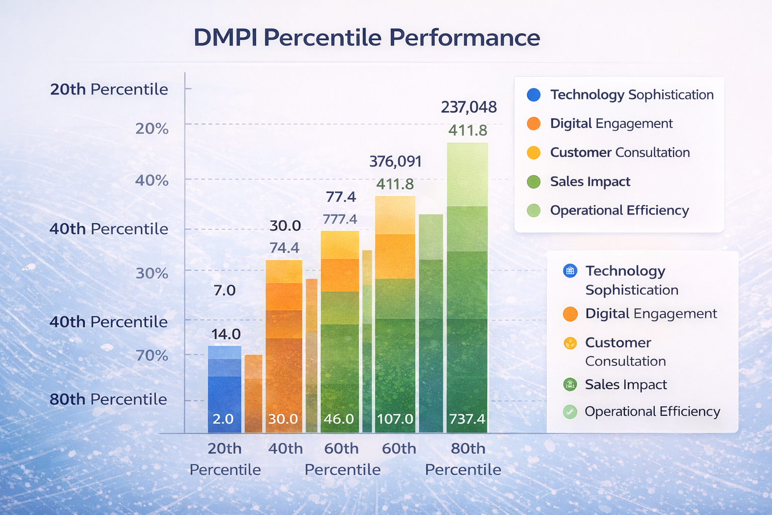 The DMPI is a weighted sum of five dimensions that represent how effectively digital tools are integrated into operations and the customer journey.